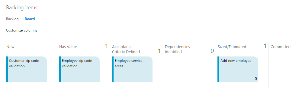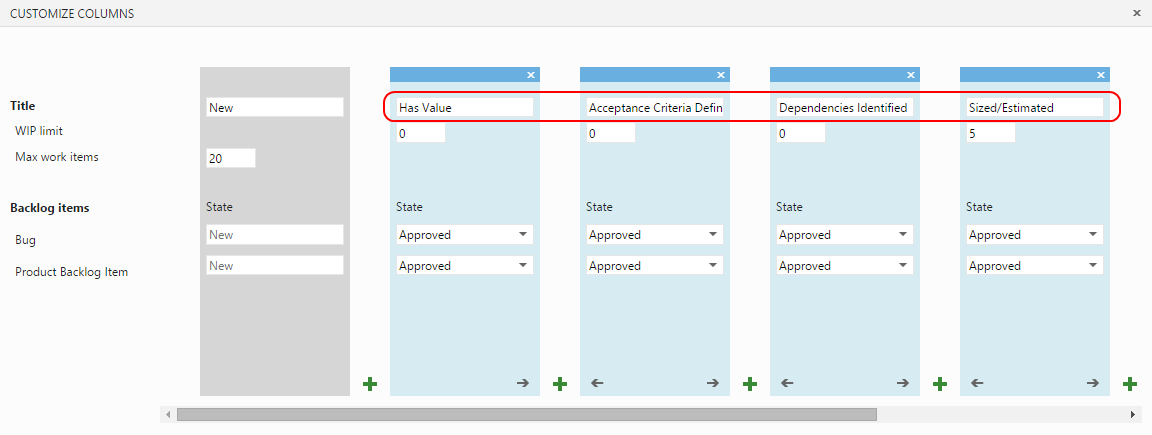Notice that I changed the original "Approved" column to "Has Value" and then added 3 additional ones. All 4 columns still map to the Approved state of the PBI, so the underlying work item type doesn't need to change - which is the beauty of this approach. I also removed the WIP limits for these columns by setting the values 0. Feel free to use WIP limits, if that makes sense for your team.